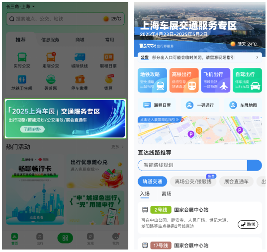 即日起,車展展商和觀眾可通過“隨申行”APP或微信小程序進入專區,一站式體驗多元交通方式指引、智能線路查詢規劃、定製“展會直通車”等全方位出行服務。