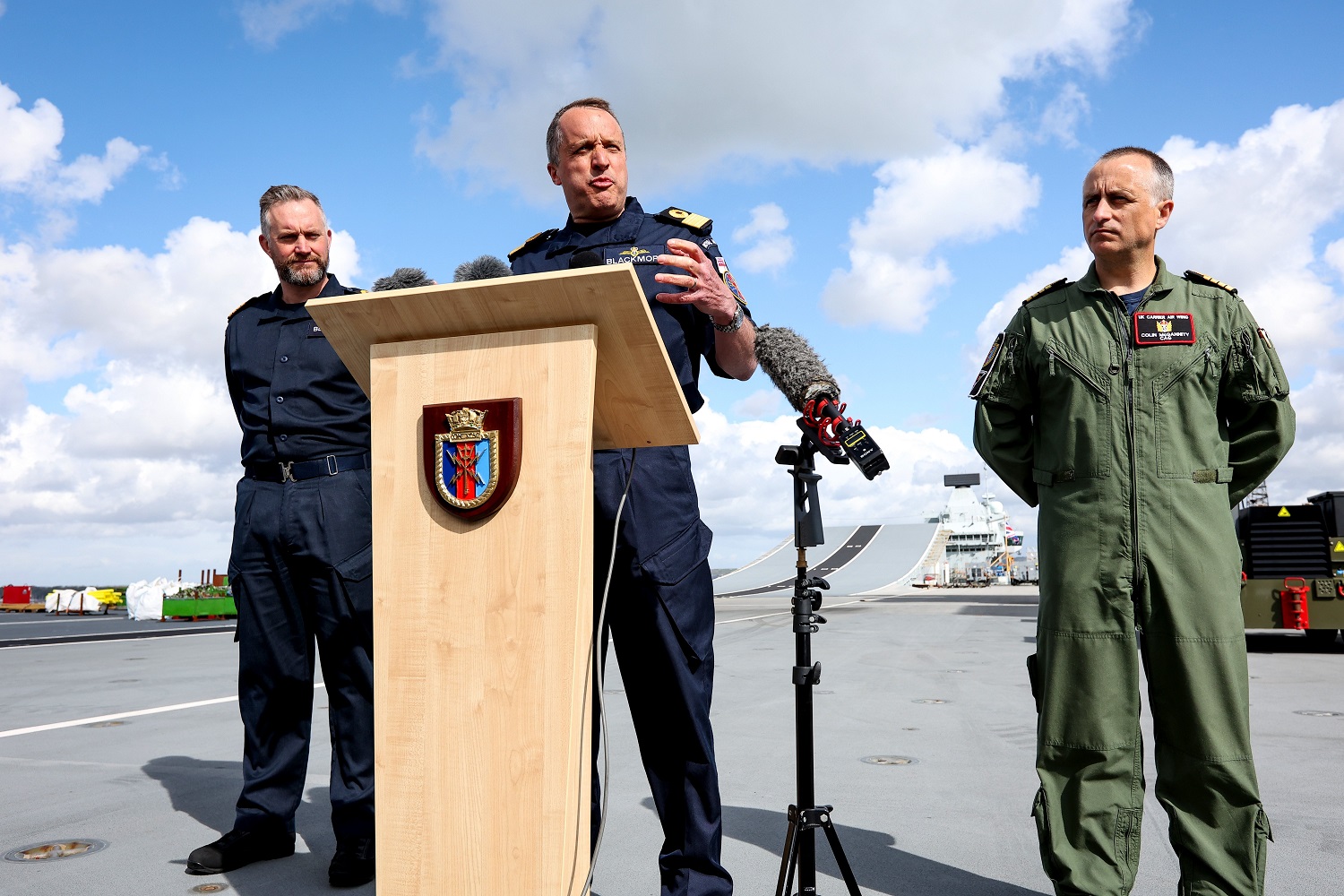 出發前在航母甲板上舉行的記者發佈會,從左到右分別為“威爾士親王”號艦長威爾·布萊克特上校、“UKCSG”打擊羣指揮官布詹姆斯·萊克莫爾准將和艦載機部隊司令柯林·麥甘尼蒂上校 《樸次茅斯新聞》官網