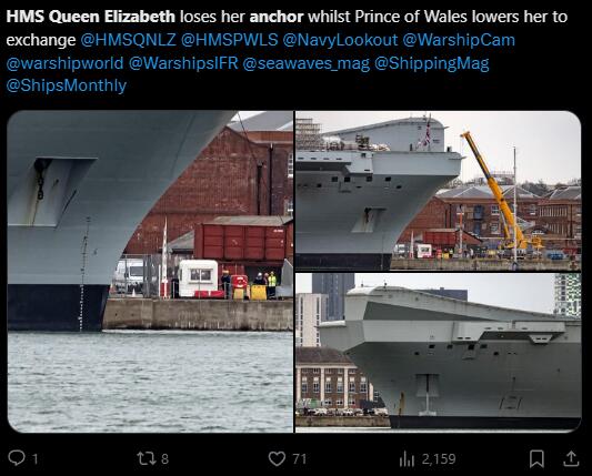 據稱是社交媒體網友發現了英國海軍兩艘航母正疑似在“拆東錨補西錨”