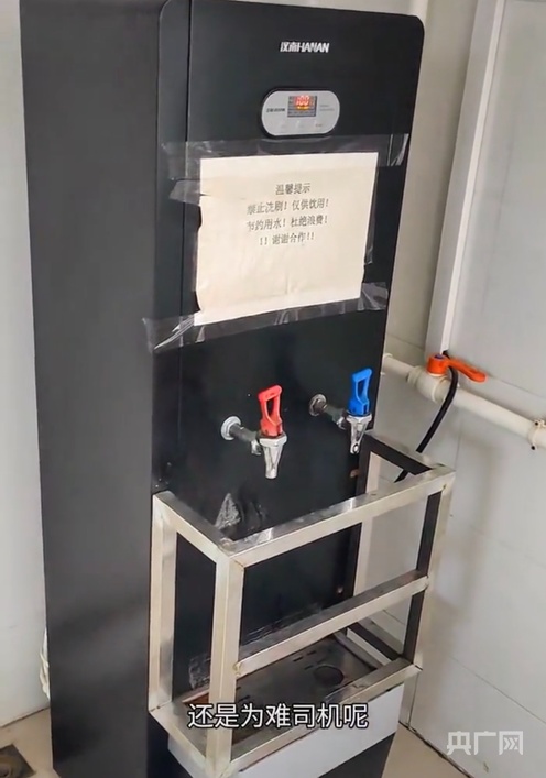 網友“幸福的小馬哥”發佈的視頻顯示,服務區內一台熱水器的水龍頭下方安裝了鐵質圍欄,熱水器上方貼了一張温馨提示,上面寫着:“禁止洗刷,僅供飲用,節約用水,杜絕浪費”等字樣。該網友稱:“免費熱水裝個圍欄,大暖瓶接不了,小水杯不夠喝……這到底是在為我們提供方便呢,還是在故意為難司機?”