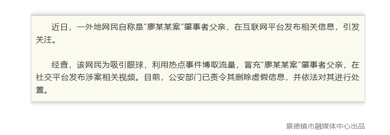 經查,該網民為吸引眼球,利用熱點事件博取流量,冒充“廖某某案”肇事者父親,在社交平台發佈涉案相關視頻。目前,公安部門已責令其刪除虛假信息,並依法對其進行處置。