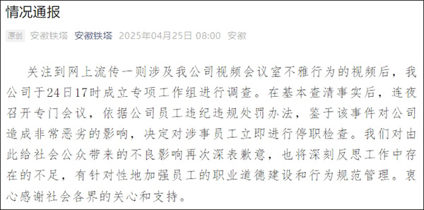 中國鐵塔股份有限公司安徽省分公司微信公眾號“安徽鐵塔”4月25日發佈情況通報稱,關注到網上流傳一則涉及該公司視頻會議室不雅行為的視頻後,該公司於24日17時成立專項工作組進行調查。在基本查清事實後,連夜召開專門會議,依據公司員工違紀違規處罰辦法,鑑於該事件對公司造成非常惡劣的影響,決定對涉事員工立即進行停職檢查。