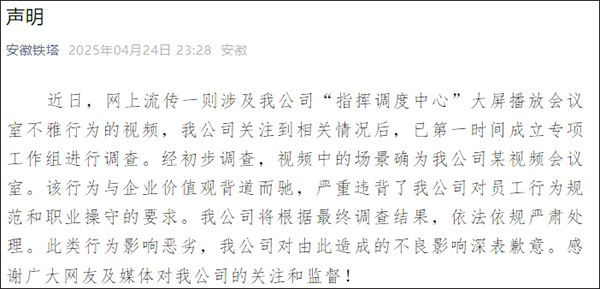 24日深夜,“安徽鐵塔”曾發佈聲明稱,經初步調查,視頻中的場景確為該公司某視頻會議室。該行為與企業價值觀背道而馳,嚴重違背了該公司對員工行為規範和職業操守的要求。該公司將根據最終調查結果,依法依規嚴肅處理。此類行為影響惡劣,該公司對由此造成的不良影響深表歉意。