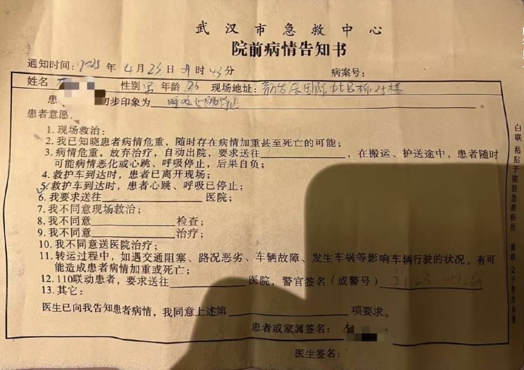 這名網友的評論區有數千條留言,不少疑似猿輔導員工留言批評公司加班嚴重,該網友回覆多條留言補充了一些信息。在評論區,有其他疑似員工曬出一張武漢市急救中心院前病情告知書,顯示26歲的李某在救護車到達時呼吸心跳已停止。告知書籤署時間為23日上午9點43分,填寫的處置地址信息,與猿輔導武漢公司辦公地址和樓層相同。