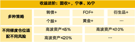 “沁寧系列”則構建了更復雜的多策略組合,在固收底倉上疊加個股精選、FOF、黃金等資產。多層次梯度佈局固收+賽道,高波資產在≤5%、≤10%、≤20%的倉位梯度均有覆蓋,部分產品設置回撤止損機制,在獲取超額收益的同時築牢風險防線,適合追求一定風險收益的客户和希望試水“固收+”領域的客户。