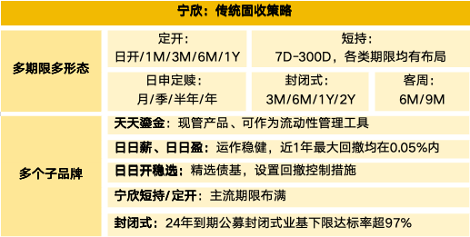 固收類王牌“寧欣系列”覆蓋多種期限形態,從日開、7天短持到2年封閉式產品等短、中、長期限均有佈局,可以滿足從零花錢到長期投資的全場景需求。其中“日日薪”“日日盈”兩款產品近一年最大回撤在0.05%以內,產品收益穩居同業前列。日日開穩選系列精選債基,並設置回撤控制措施嚴控波動,1年期定開產品近一年兑付年化收益均在2.9%以上。封閉式持續滾動發行,2024年到期公募封閉式業基下限達標率超過97%。