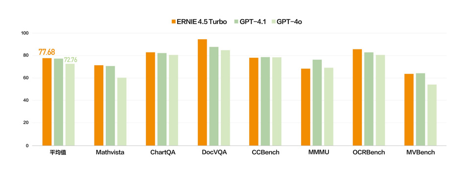 “多模態將成為未來基礎模型的標配,純文本模型的市場會越變越小,多模態模型的市場會越來越大,”李彥宏表示。文心4.5 Turbo的多項基準測試成績顯著優於GPT 4o,平均分達到77.68,超過GPT 4o的72.76。