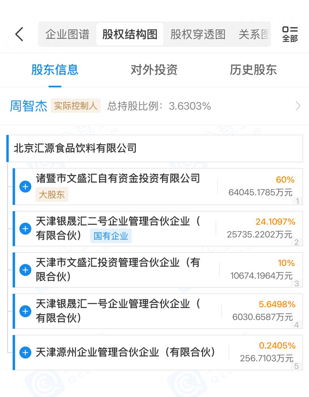 根據企查查數據,目前,北京匯源的最大股東為諸暨市文盛匯自有資金投資有限公司,持股比例為60%。