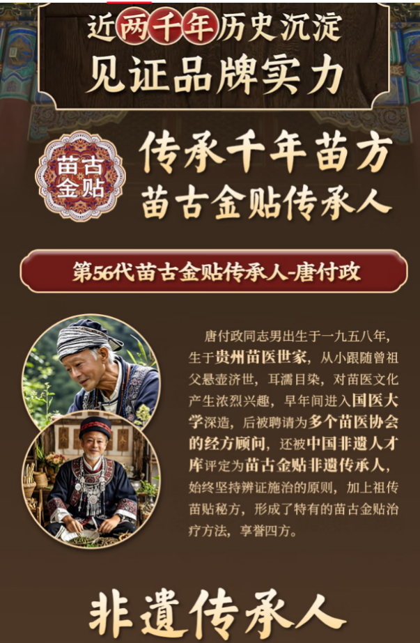 記者搜索發現,在多個電商平台,苗古金貼產品正在熱銷。在產品介紹頁面上寫着“第56代苗古金貼傳承人”唐付政,生於貴州苗醫世家,早年進入“國醫大學”深造……還被中國非遺人才庫評定為苗古金貼非遺傳承人,形成了特有的苗古金貼治療方法,享譽四方。