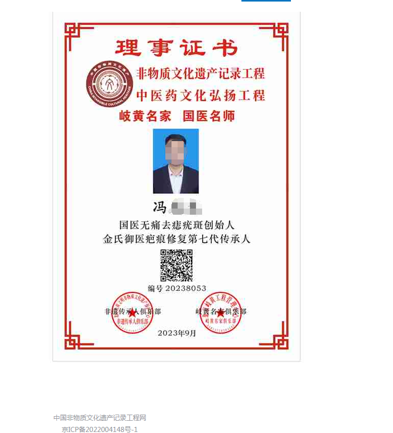 記者調查發現,AI人唐付政的所謂“苗古金貼非遺傳承人”稱號,實際上是由一家名為“北京炎黃文明非物質文化遺產保護中心”的企業頒發,對應可以檢索到中國非物質文化遺產記錄工程網。該網站有很多所謂的“非遺傳承人”,例如“金氏御醫疤痕修復第七代傳承人”“疑難雜症診療法傳承人”等。