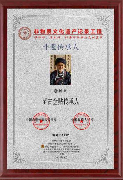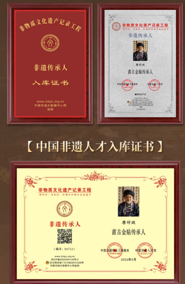記者還在該網站查詢到,唐付政“苗古金貼傳承人”項目於2024年8月辦理成功。