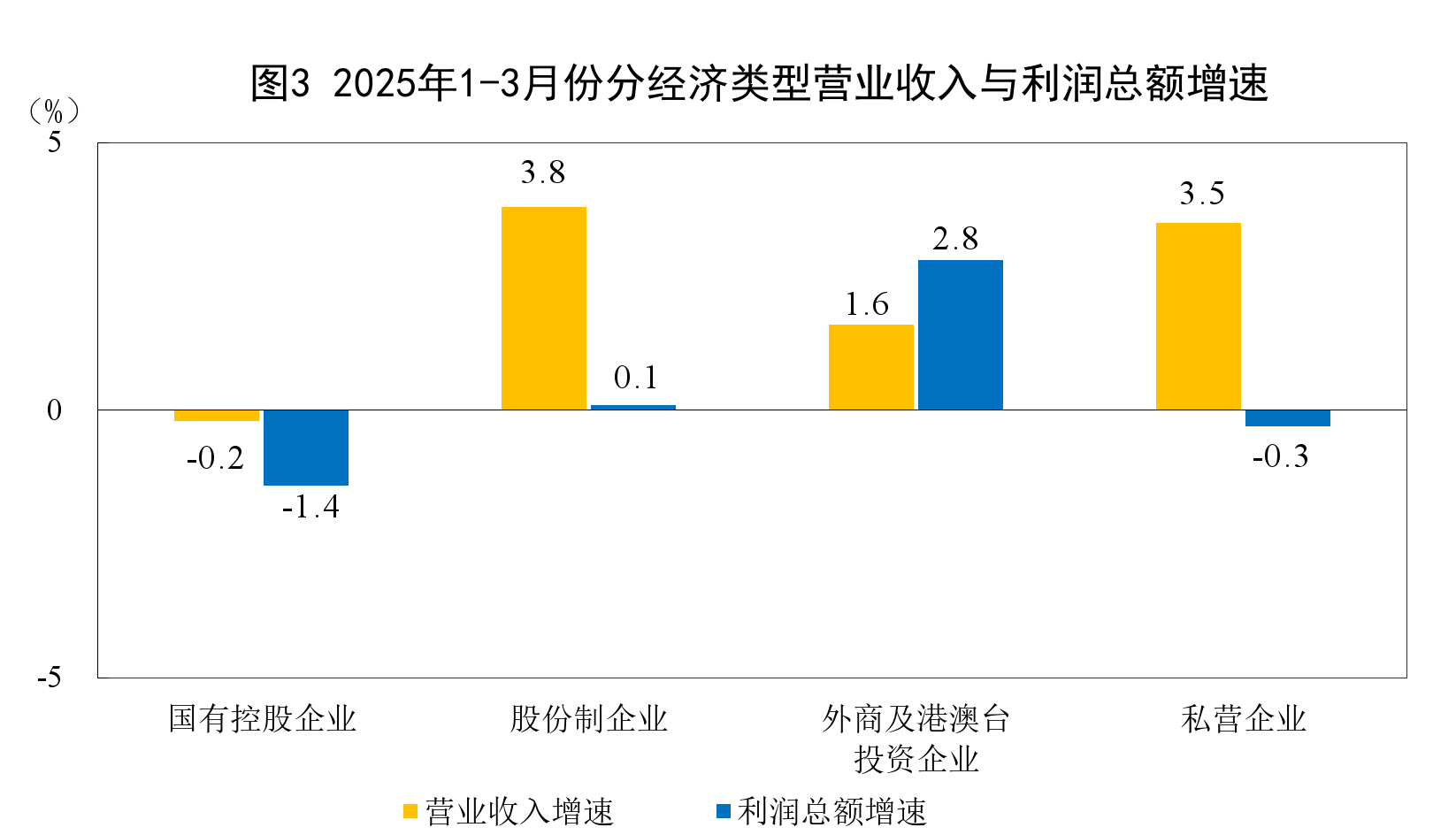 1-3月份,規模以上工業企業中,國有控股企業實現利潤總額5599.5億元,同比下降1.4%;股份制企業實現利潤總額11101.5億元,增長0.1%;外商及港澳台投資企業實現利潤總額3883.5億元,增長2.8%;私營企業實現利潤總額3709.7億元,下降0.3%。