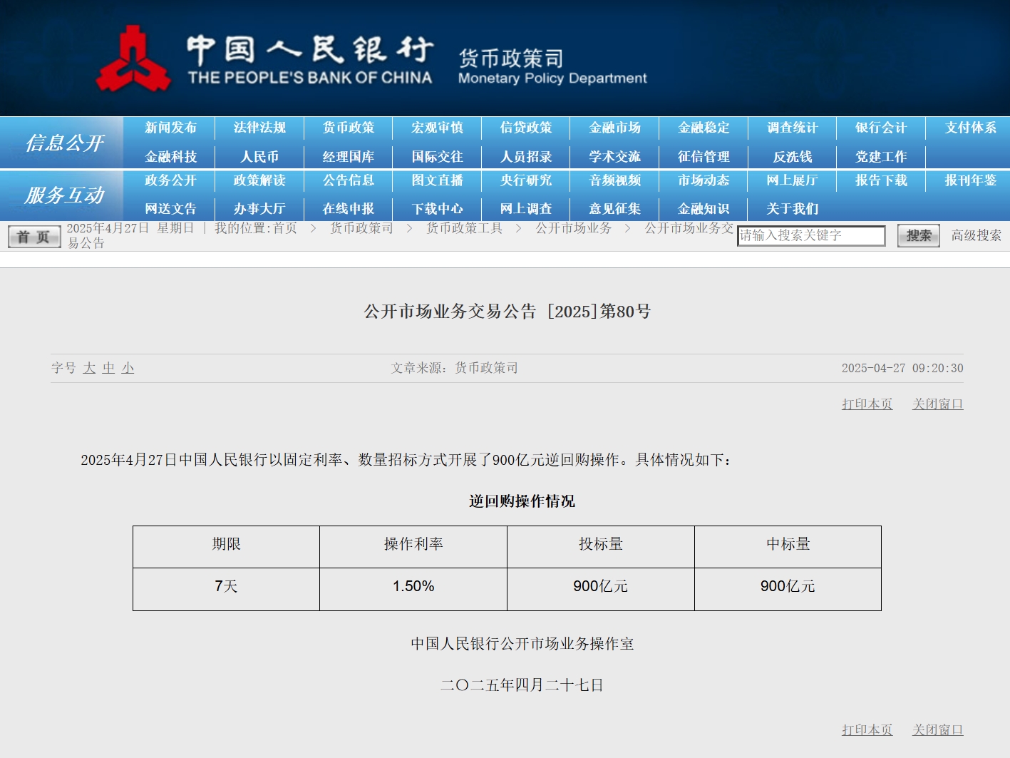 中國人民銀行貨幣政策司4月27日發佈公告稱,2025年4月27日中國人民銀行以固定利率、數量招標方式開展了900億元逆回購操作,操作利率為1.50%。