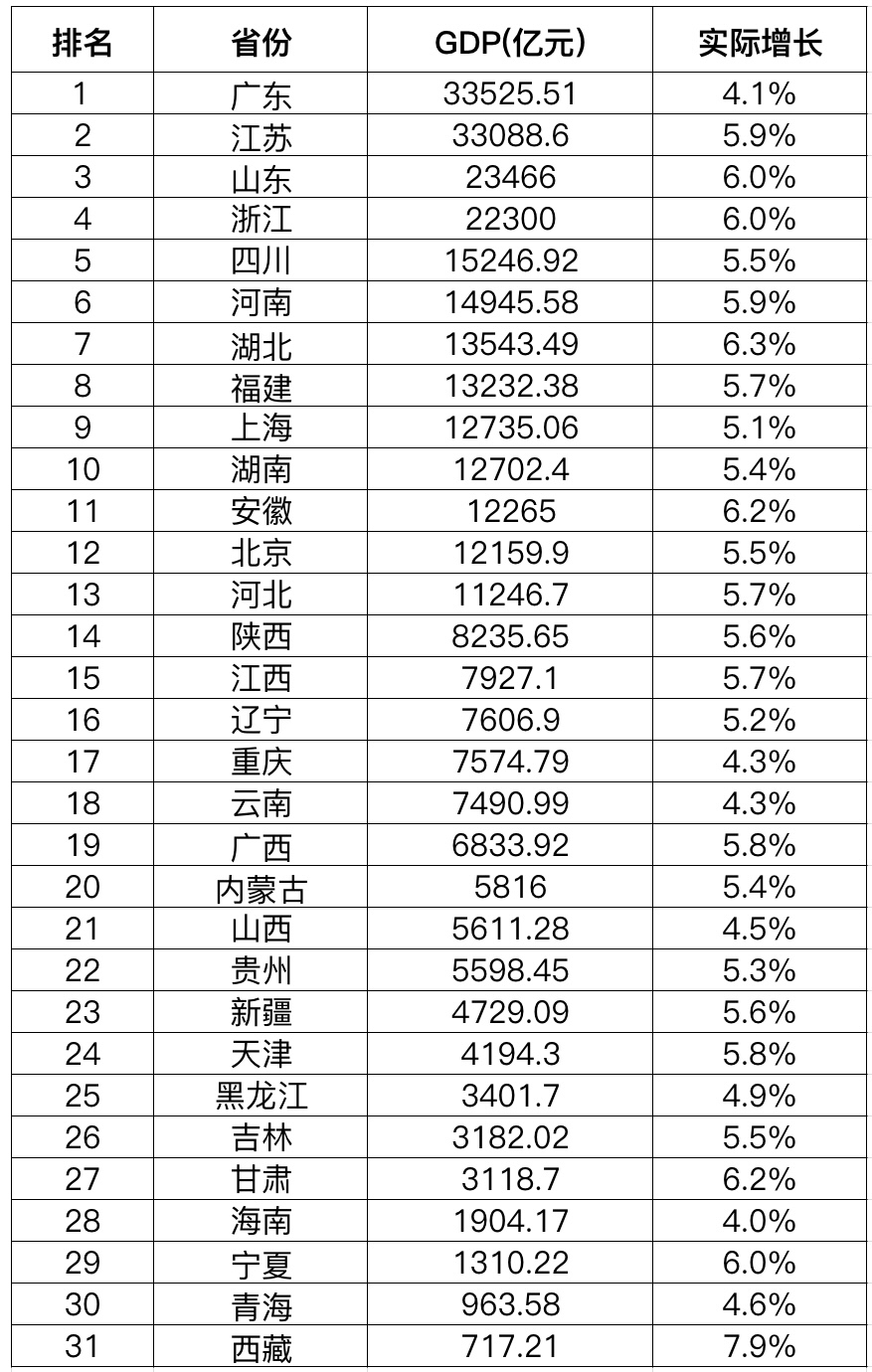其他10個經濟大省中,山東、浙江、安徽的GDP增速也達到“6字頭”,分別為6.0%、6.0%、6.2%;江蘇、河南、福建、四川也取得高於全國平均水平(5.4%)的增長,增速分別為5.9%、5.9%、5.7%和5.5%;上海增速也超過預定目標;僅廣東省的增速低於預定目標,湖南省(5.4%)基本達到預定目標(增長5.5%左右)。