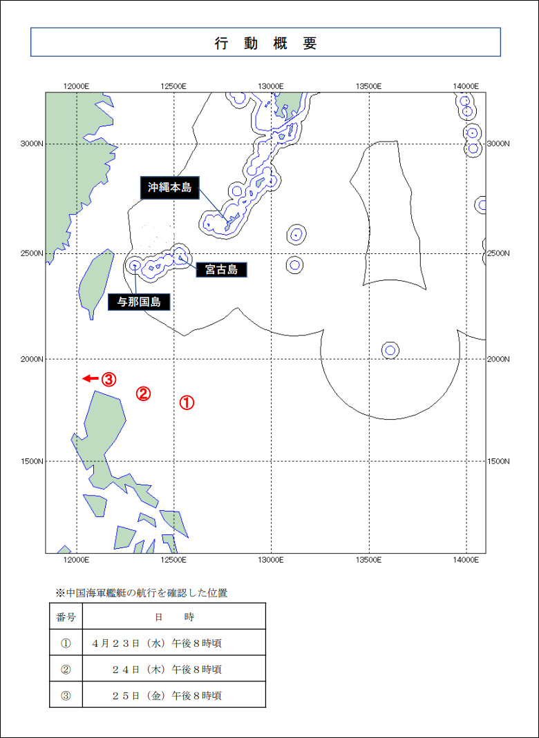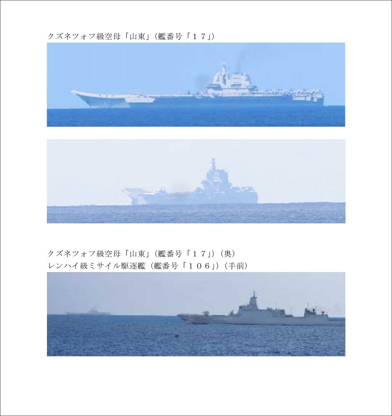日本海上自衞隊觀測到山東艦航母戰鬥羣包括055型導彈驅逐艦延安艦、咸陽艦,052D型驅逐艦湛江艦,054A型護衞艦衡水艦。從4月23日到4月25日,日本海上自衞隊記錄到山東艦進行了70架次殲15艦載戰鬥機起降和60架次艦載直升機起降,共計130架次。
