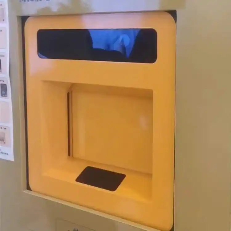 “黃金ATM機”外觀為金燦燦的黃色,兩端的櫃體上方的燈箱,分別標註着“智能黃金回收”和“自助黃金購買”字樣。兩端櫃體由中間的圓筒狀裝飾件連接,裝飾件上方的燈箱標註有“智慧金店”5個大字,以及設備研製單位等信息。