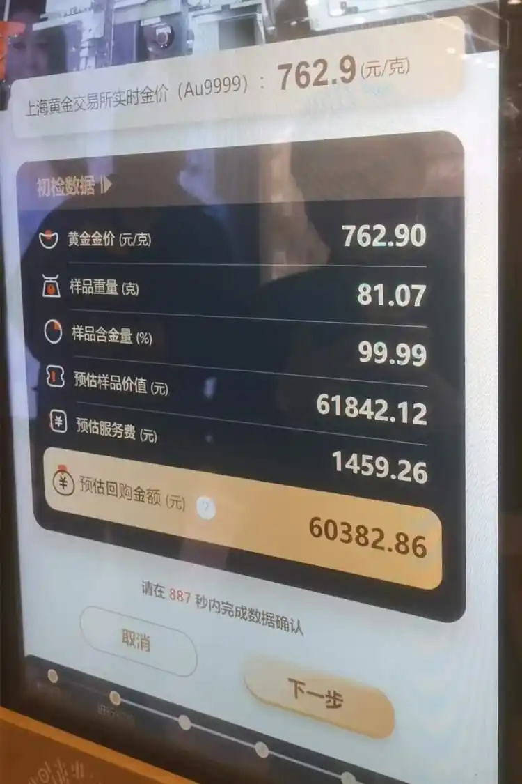 “設備對金飾品進行的初檢是無損檢測,”設備方工作人員謝先生介紹説,初檢的結果包括金飾品重量,黃金含量,上海黃金交易所即時金價,金飾品的預估價值,預估服務費,以及扣除服務費後預估回購金額等信息,均在液晶屏上顯示,一目瞭然。