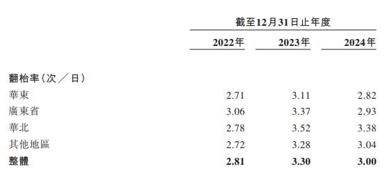 同樣下滑的還有綠茶曾引以為傲的翻枱率。根據最新披露的招股書,2022-2024年,綠茶的翻枱率分別為2.81、3.30和3.00次,其中,大本營華東地區更是低至2.82次。
