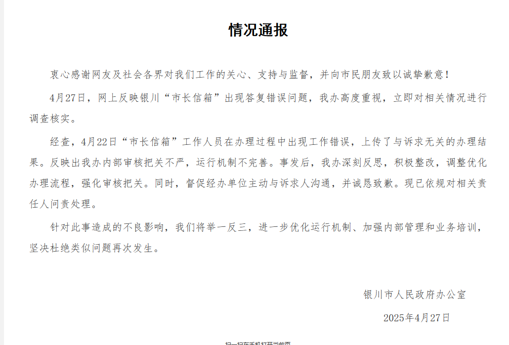 銀川市人民政府網站27日發佈情況通報:系“市長信箱”工作人員在辦理過程中出現工作錯誤,將積極整改。同時,督促經辦單位主動與訴求人溝通,並誠懇致歉,現已依規對相關責任人問責處理。