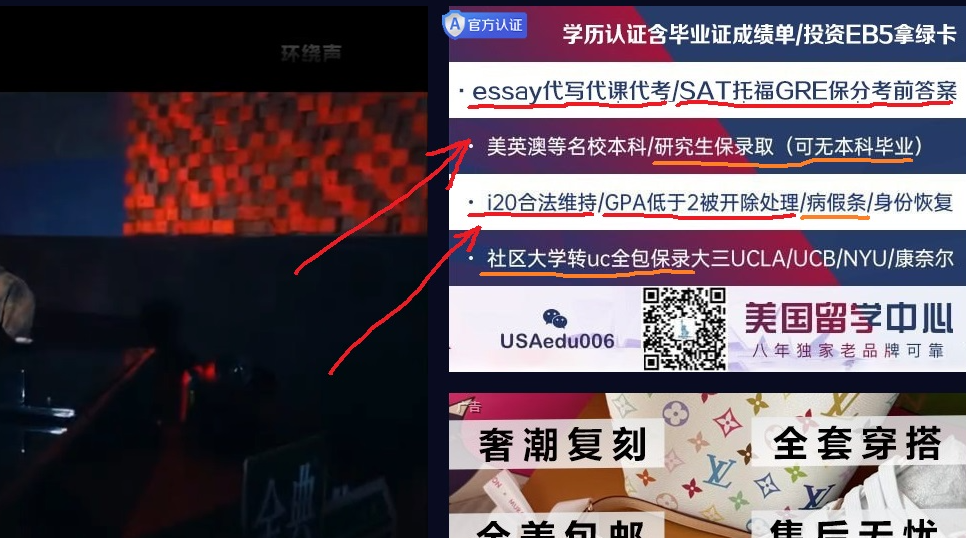 僅以整體素質在發展中國家學生中可能位於最高水平的中國大陸留學生來看,以某面向海外漢語母語學生的盜版文化網站4月21日的廣告欄為例,黃筆劃出的部分(本科肄業申碩、病假條、社區大學轉名校)屬於灰色業務,而紅筆業務(槍手、標化賣題、掛身份、開除改試讀)幾乎必定違法