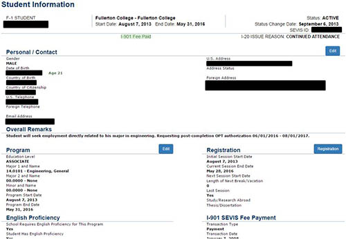 “學生和交流訪問者信息系統”(SEVIS)是美國政府用於跟蹤留學生學籍狀態的數據庫,除綠卡或“工作簽證外國人配偶”等個別特殊身份的留學生外,絕大部分外國留美學生會被分配一個SEVIS記錄號。這東西我們中國的留學生很容易理解——這就是學籍檔案嘛:自己的基本信息(姓名、地址、聯繫方式)、學校和學籍狀態(入學、停學、開除、勸退、畢業實習),以及被定罪的違法記錄等都會反映在這裏。