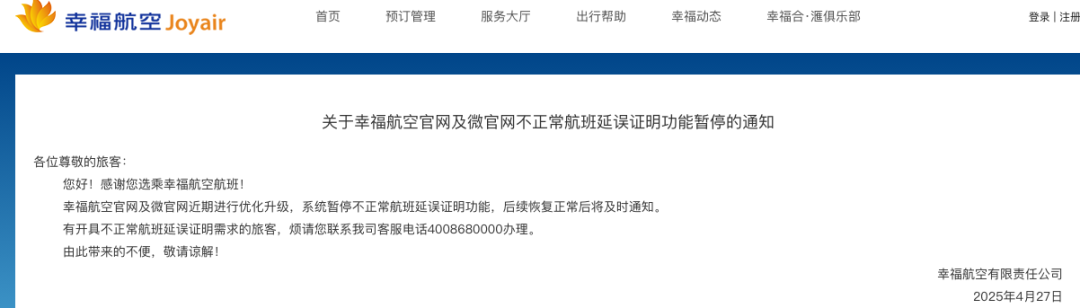 幸福航空官方網站於27日發佈《關於幸福航空官網及微官網不正常航班延誤證明功能暫停的通知》,稱近期進行優化升級,系統暫停不正常航班延誤證明功能,後續恢復正常後將及時通知。此前亦有航空自媒體發文稱,幸福航空內部發文取消今年“五一”假期前所有的航班。