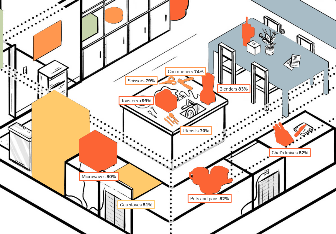 通過滾動鼠標滑輪,《紐約時報》首先帶領我們進入的是美國家庭的廚房,這裏很容易就能看出美國對中國的依賴——中國在大量生產如餐具和烹飪用具等商品方面,一直處於全球領先地位。