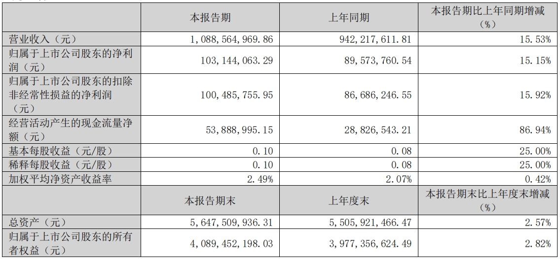 數據顯示,企業報告期內實現了營業總收入10.89億元,同比上升15.53%;歸母淨利潤達到1.03億元,同比增長15.15%;扣非淨利潤為1億元,同比增長15.92%。