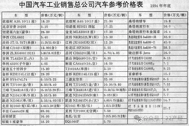 1994年,中國汽車工業銷售總公司汽車參考價格表。 圖源:新浪汽車