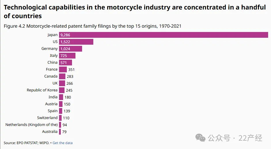 1970年至2021年,按15個國際與地區劃分的摩托車相關專利數量,日本以9286專利數斷層排行第一。 圖源:EPO PATSTAT