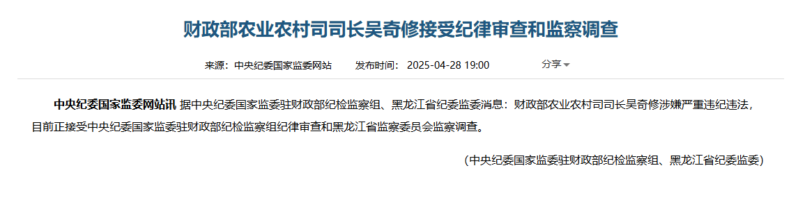 4月28日,據中央紀委國家監委駐財政部紀檢監察組、黑龍江省紀委監委消息:財政部農業農村司司長吳奇修涉嫌嚴重違紀違法,目前正接受中央紀委國家監委駐財政部紀檢監察組紀律審查和黑龍江省監察委員會監察調查。