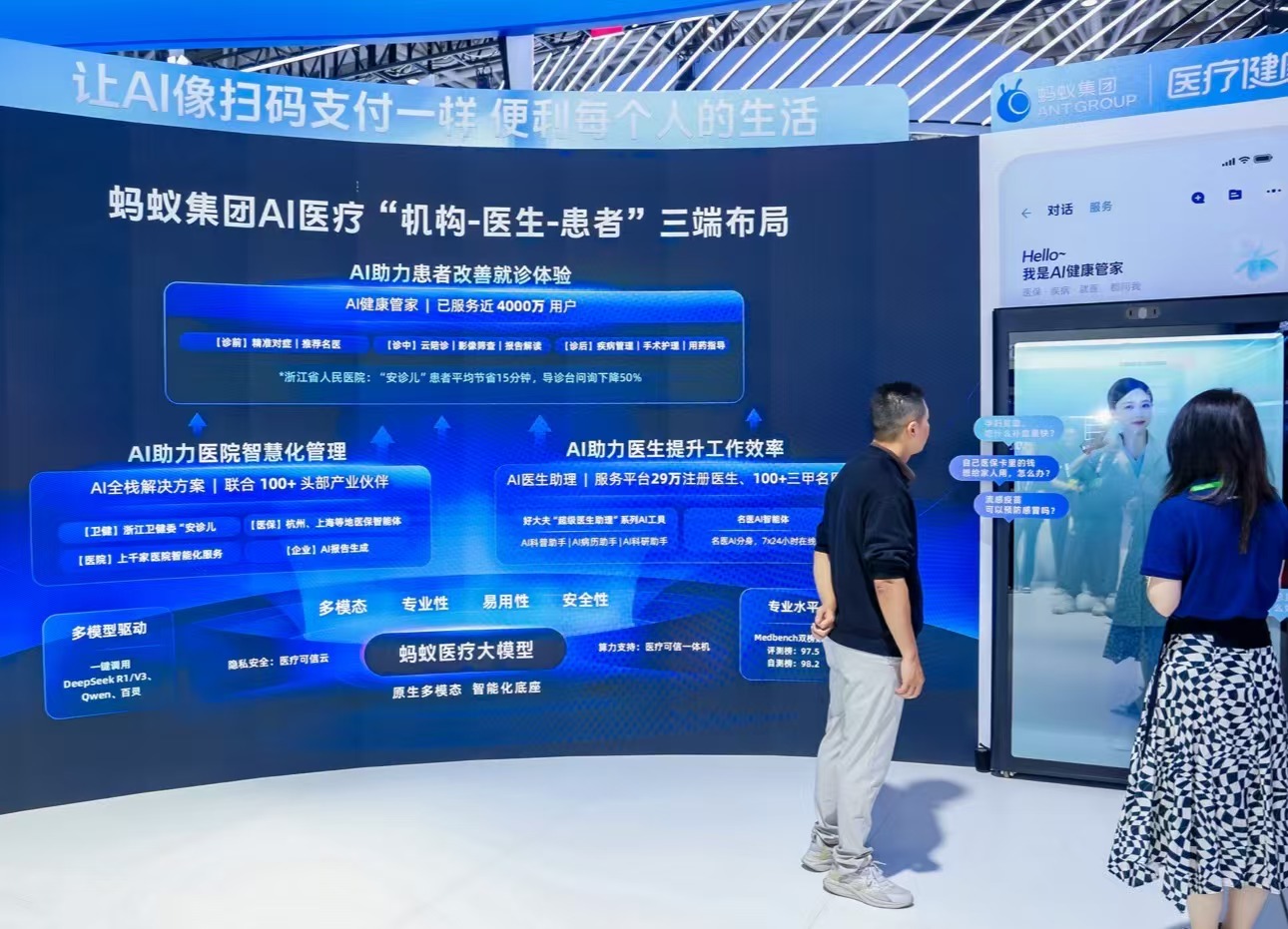 踏入螞蟻集團展區,首先映入眼簾的是螞蟻集團醫療AI產業佈局圖,展示了螞蟻用AI幫助普通人看病的技術探索和應用實踐。