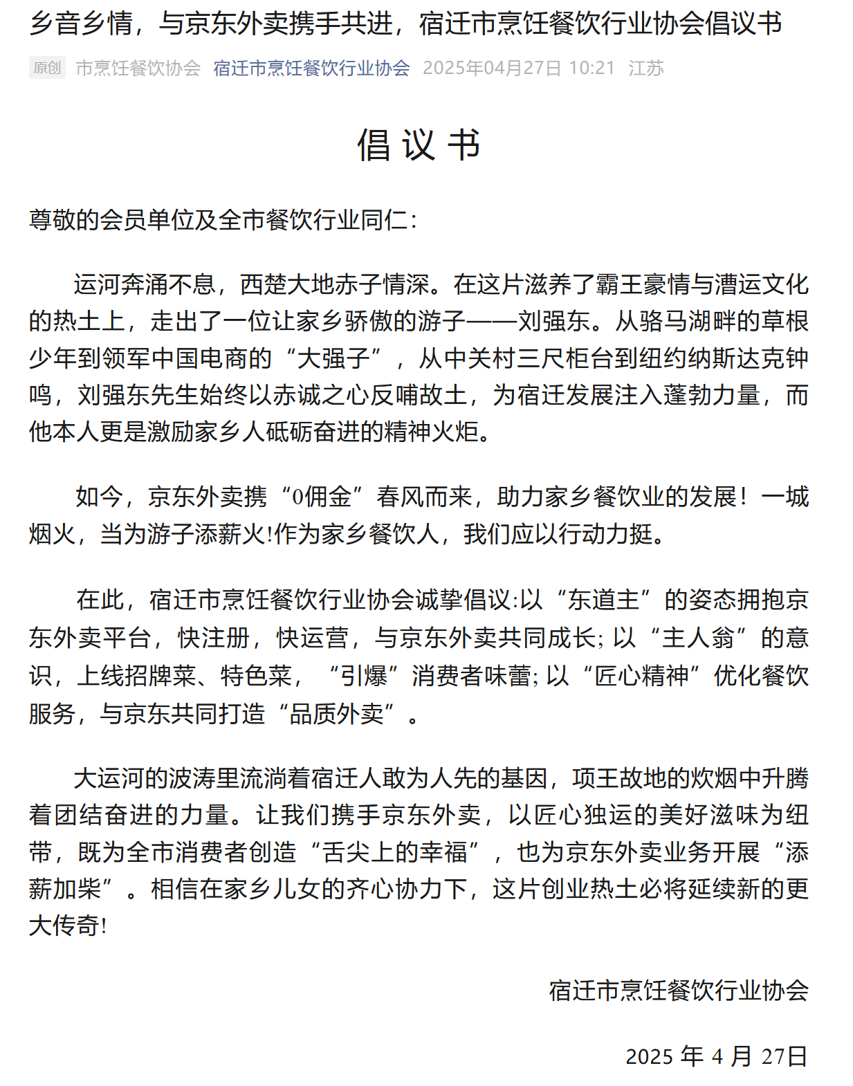 4月27日,江蘇宿遷市烹飪餐飲協會發文倡議會員單位以及全市餐飲行業,以“東道主”的姿態擁抱京東外賣平台,快註冊,快運營,與京東外賣共同成長。