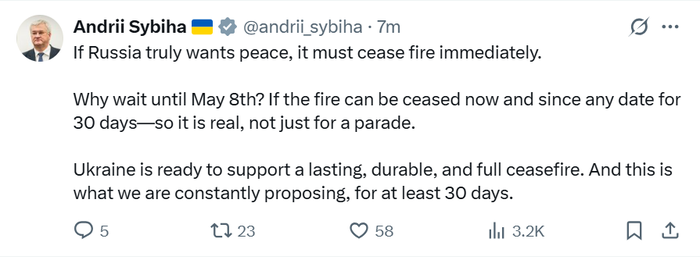 針對俄羅斯的停火決定,烏克蘭外長瑟比加28日通過社交媒體發文稱,如果俄羅斯真的想要和平,就應該立即停火,而不是等到5月8日。瑟比加還稱,停火“應該是真實的,而不僅僅是為了遊行”。