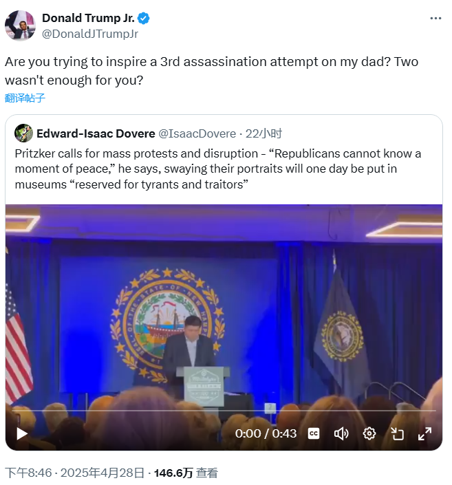 當地時間4月27日,美國伊利諾伊州民主黨籍州長普利茲克呼籲對特朗普政府進行大規模抗議。特朗普長子小特朗普(Donald Trump Jr.)28日在X網站轉發了普利茲克的演講視頻,並批評稱:“你是想煽動對我爸的第三次暗殺嗎?兩次還不夠嗎?”