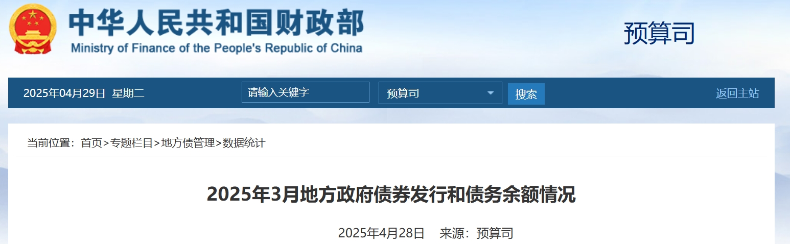 財政部預算司4月28日發佈2025年3月地方政府債券發行和債務餘額情況: