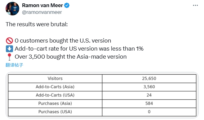據其統計,在試驗期間,共有約2.5萬名美國消費者瀏覽了購買頁面,其中3560人將“亞洲製造”版本加入購物車,584人完成購買;而“美國製造”版本僅有24人加購,卻無一人真正下單。