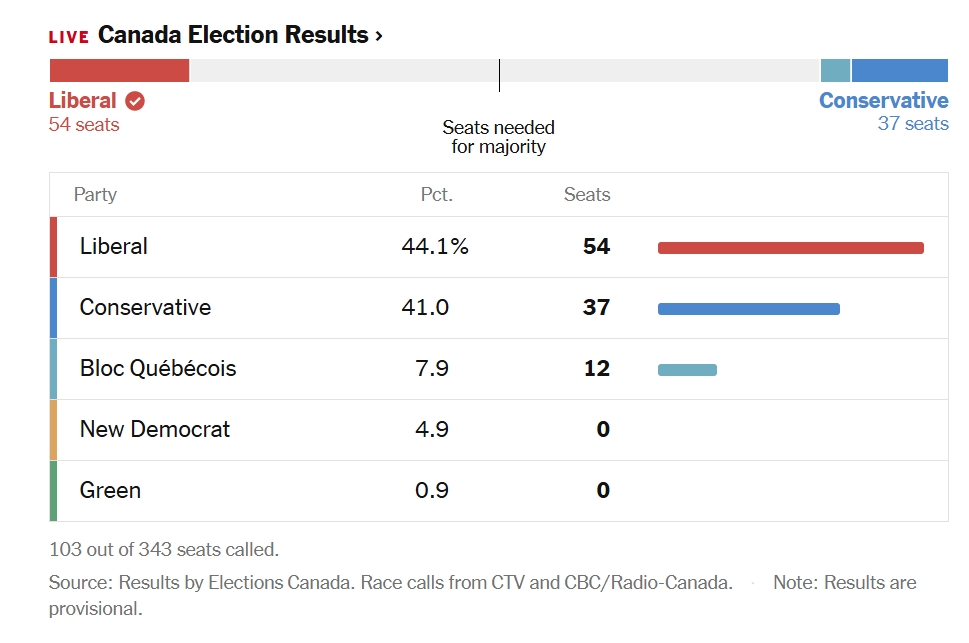 加拿大廣播公司報道,初步結果顯示,卡尼領導的加拿大自由黨預計在28日的聯邦眾議院選舉中獲勝。