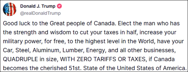 特朗普在其自創的社交媒體“真相社交”(Truth Social)上發帖表示,加拿大選民應選出一位“有力量和智慧的人”,“免費將軍事力量提升至世界最高水平”,將“汽車、鋼鐵、鋁、木材、能源及其他產業規模翻四倍,且零關税”,只要成為美國“珍愛的第51個州”,這一切都可實現。“別再受制於多年前人為劃定的邊界線。看看這片土地(合為一體)該有多美!完全自由的往來,再無邊界阻隔。全是好處,沒有壞處。這是天作之合!”特朗普寫道,“美國不能再像過去那樣,每年向加拿大提供數千億美元的補貼。除非加拿大是一個州,否則這毫無意義!”
