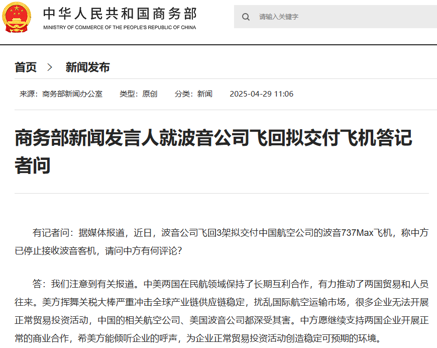 據商務部網站4月29日消息,商務部新聞發言人就波音公司飛回擬交付飛機答記者問。