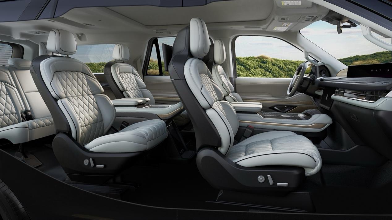 在座艙方面,全新領航員的座艙採用2-2-3的7座佈局,前排及第二排座椅均標配座椅加熱、通風及按摩功能,全車座椅均採用蘇格蘭Bridge of Weir全粒面半苯胺高級皮質包覆,且均支持電動調節。此外,全車共配備28揚聲器頂級鋭威音響。
