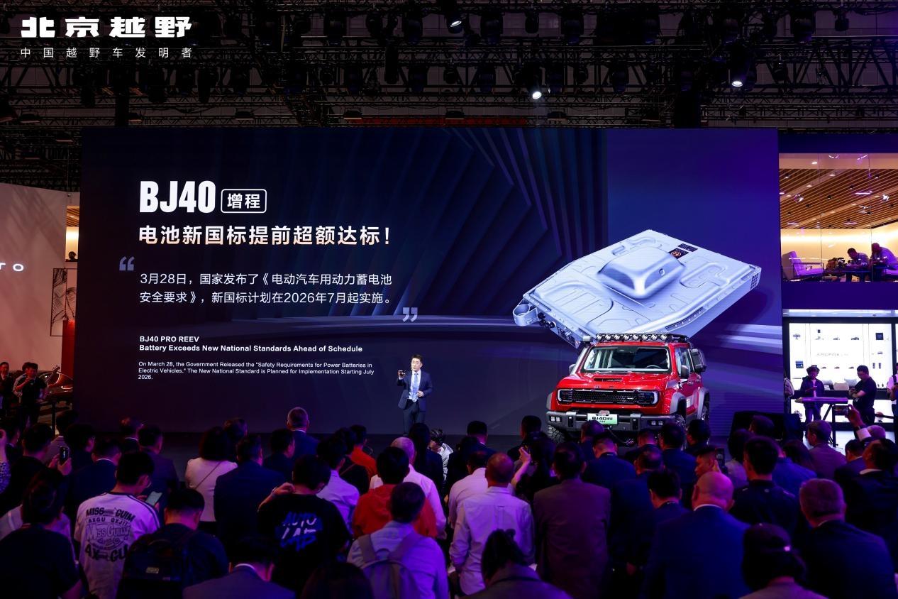 據悉,在電池安全方面,BJ40增程所搭載的動力電池開發標準高於現行國標及新國標,滿足將於2026年7月1日起實施的《電動汽車用動力蓄電池安全要求》中的規範。