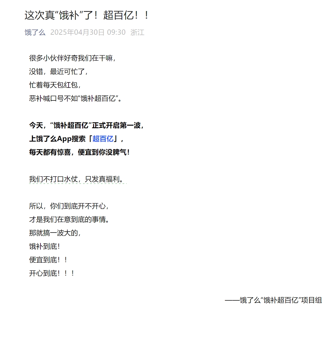 4月30日,餓了麼宣佈進一步加大平台補貼力度,正式開啓平台“餓補超百億”大促:即日起,平台將通過一系列驚喜活動,為消費者持續提供優惠、開心的消費體驗。