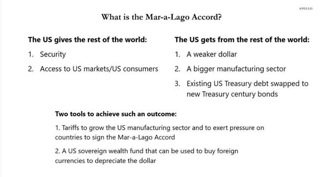 由於這一方案在邏輯上有些類似1985年的廣場協議,人們便戲稱它為“第二版廣場協議”,但這完全是一廂情願的設想,與常識相悖。就目前的情況而言,雖然不排除米勒等人對特朗普產生了一定影響,但在對華經貿政策形成過程中,除了米勒之外,彼得·納瓦羅、羅伯特·貝森特等人物同樣具有重要影響力。因此,特朗普的關税與貿易舉措並非完全照搬傳聞中的“海湖莊園協議”——其政策中或許能看到該文件的部分影子,但並非全盤採納。