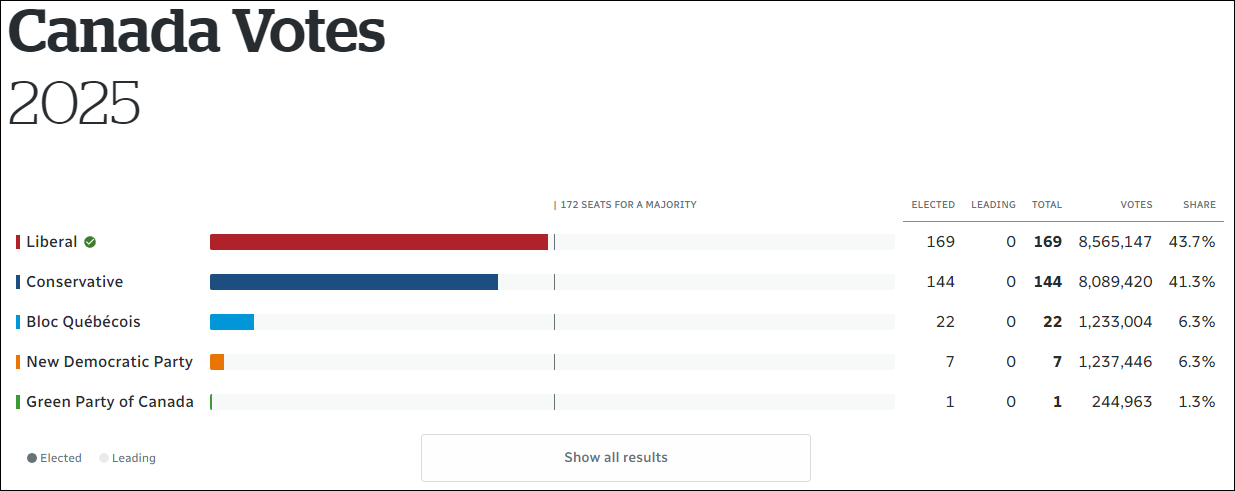在當地時間4月28日舉行的加拿大聯邦眾議院選舉中,據加拿大廣播公司(CBC)報道,現任總理卡尼領導的自由黨拿下眾議院343個議席中的169席,成為議會第一大黨,確定將繼續執政。不過,自由黨的席位未能過半,無法單獨組閣以組成多數政府。