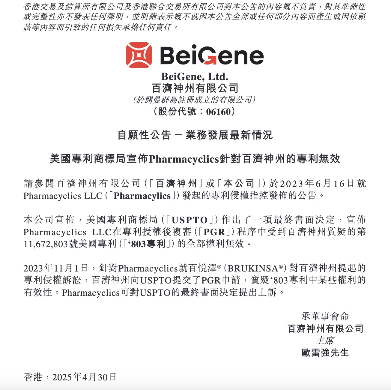 4月30日,百濟神州公告表示,美國專利商標局(USPTO)近日作出決定,宣告Pharmacyclics公司持有的第11672803號美國專利(以下簡稱“803專利”)全部權利要求無效。