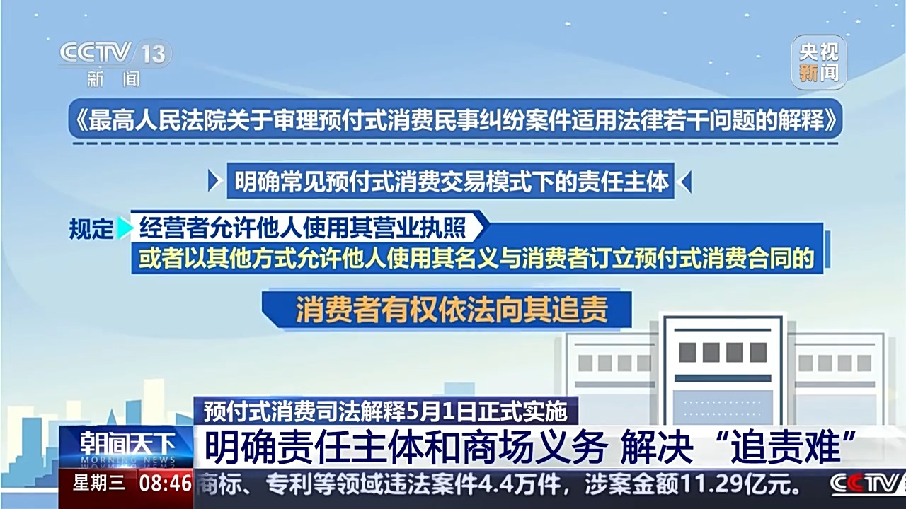 司法解釋明確了常見預付式消費交易模式下的責任主體,規定:經營者允許他人使用其營業執照,或者以其他方式允許他人使用其名義與消費者訂立預付式消費合同的,消費者有權依法向其追責。