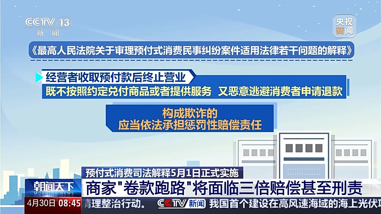 明天,也就是5月1日起,最高人民法院預付式消費司法解釋正式實施,以後遇到“捲款跑路”“退卡難”這些糟心事,可以用新規維權了!