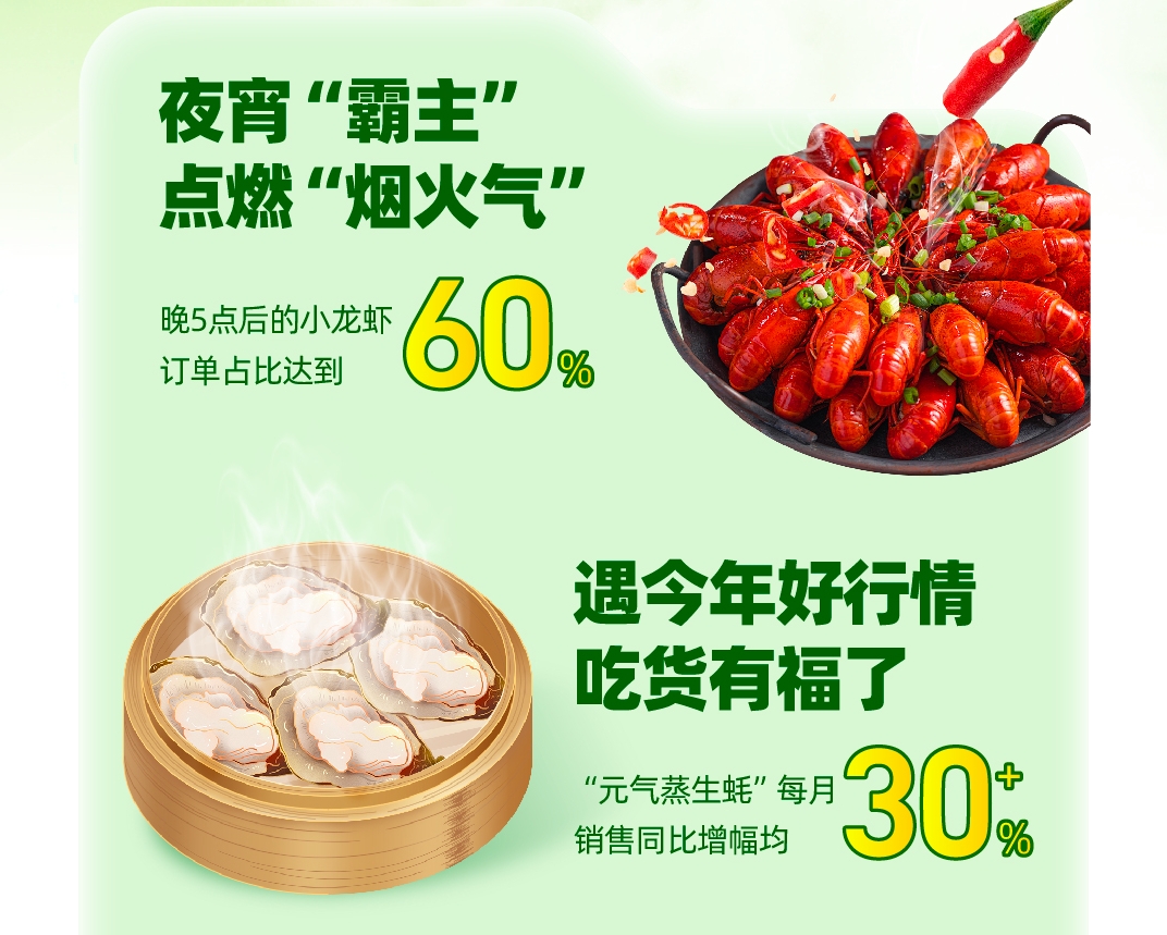 上市以來,小龍蝦點燃了今年的“煙火氣”。報告顯示,在盒馬“煙火氣”商品清單中,小龍蝦穩居夜宵“霸主”,下午5點後的訂單佔比超過了六成。進入5月,隨着多個產地的小龍蝦批量上市,價格預計還會迎來一波 “跳水”,“龍蝦自由”季也將隨之到來。