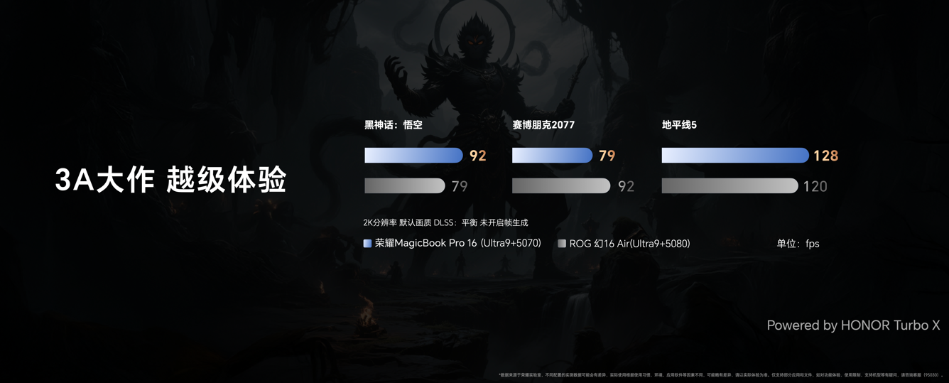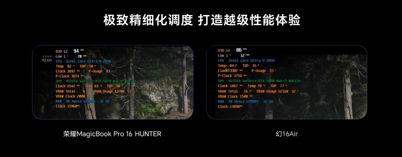 榮耀MagicBook Pro 16 HUNTER版2025擁有智能、高能、狂戰三檔性能模式可選,在狂戰模式下,整機最高可釋放150W超強性能。在HONOR Turbo X調校技術加持下,這款筆記本在不少主流3A和網遊中實測的遊戲幀率都達到行業領先水平,為用户帶來更強大和流暢的越級體驗。
